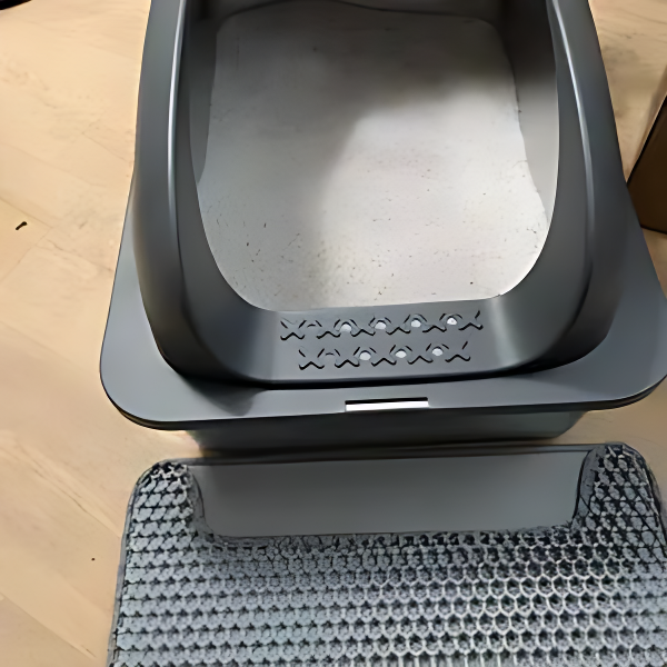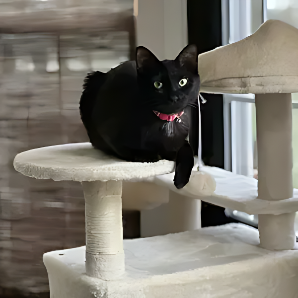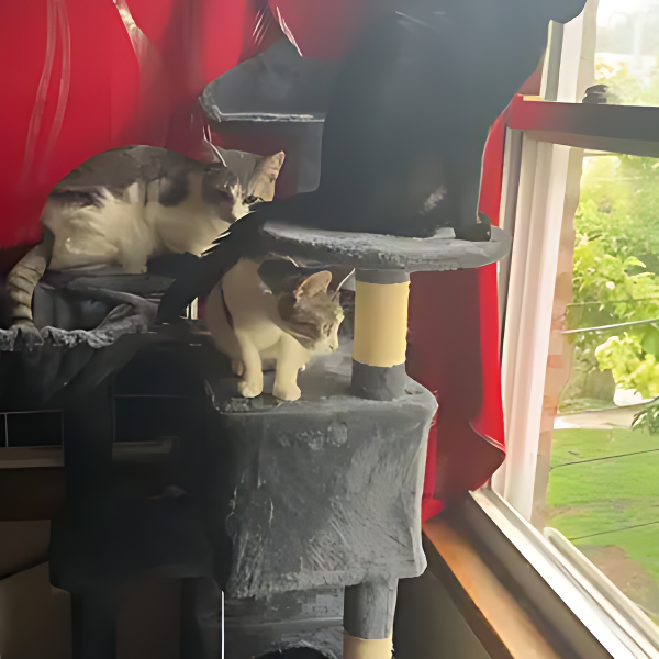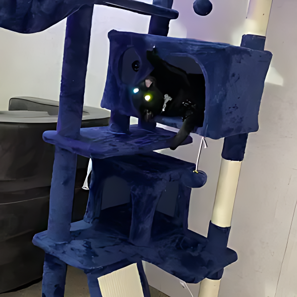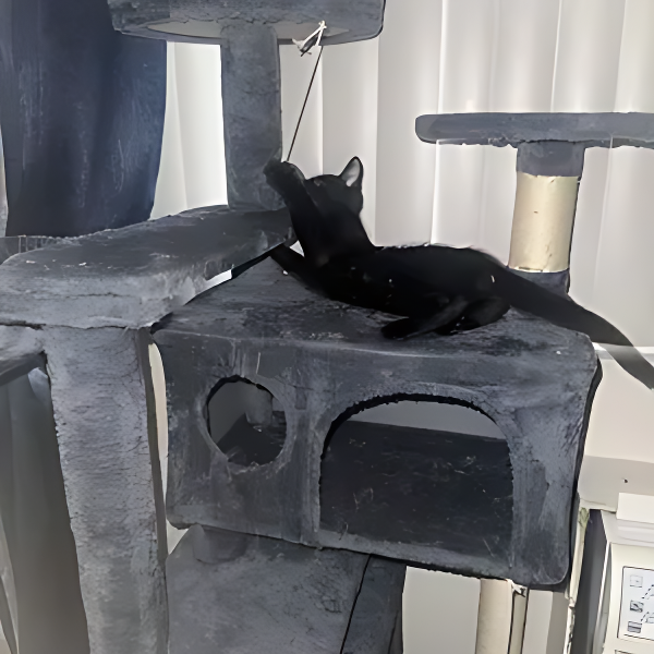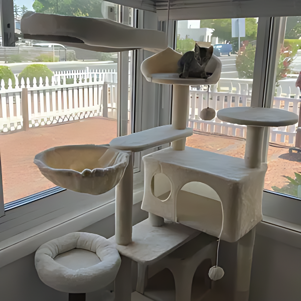 The cat tree is constructed from durable engineered wood and covered in soft faux fleece, providing a comfortable and sturdy play environment.