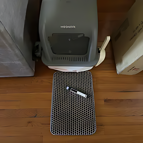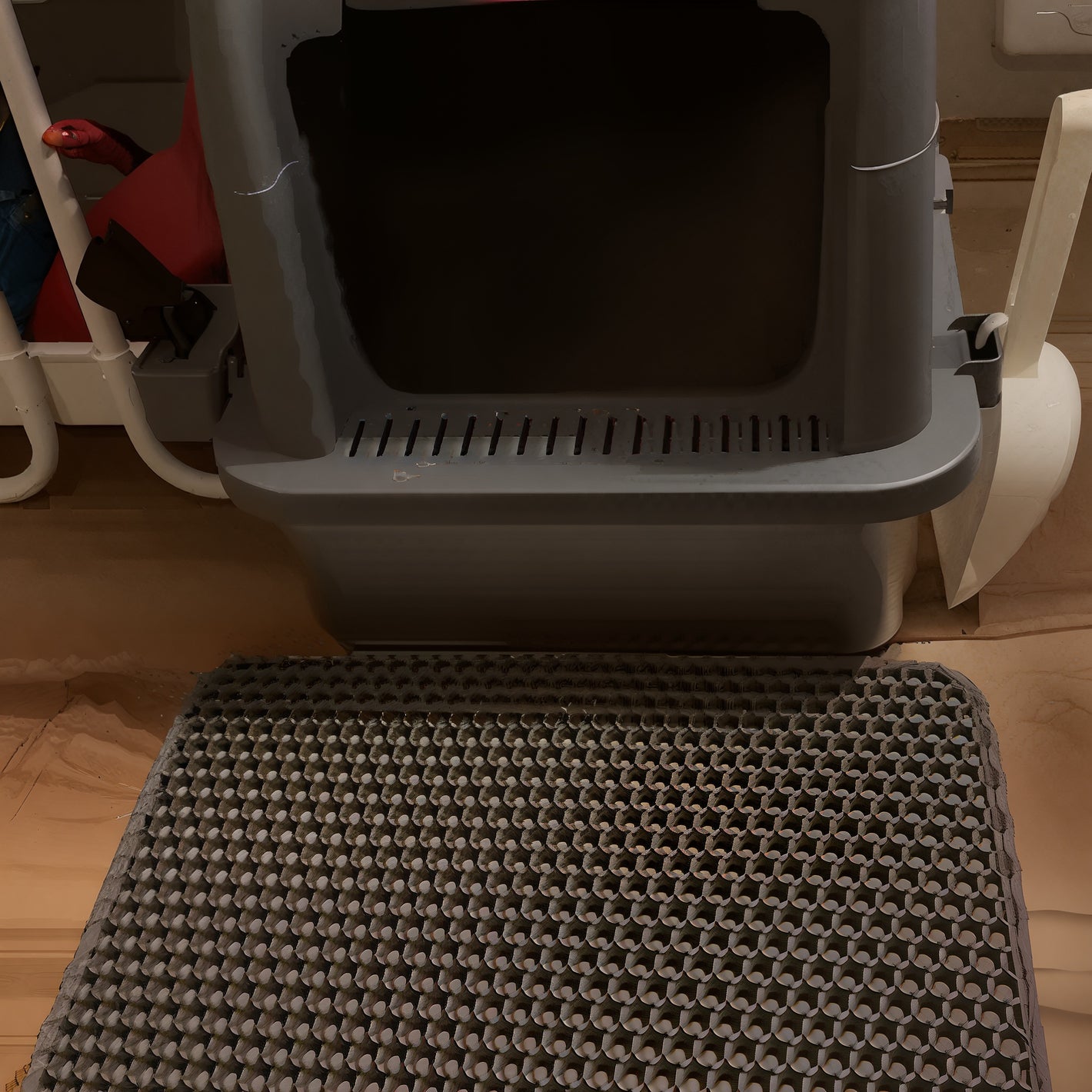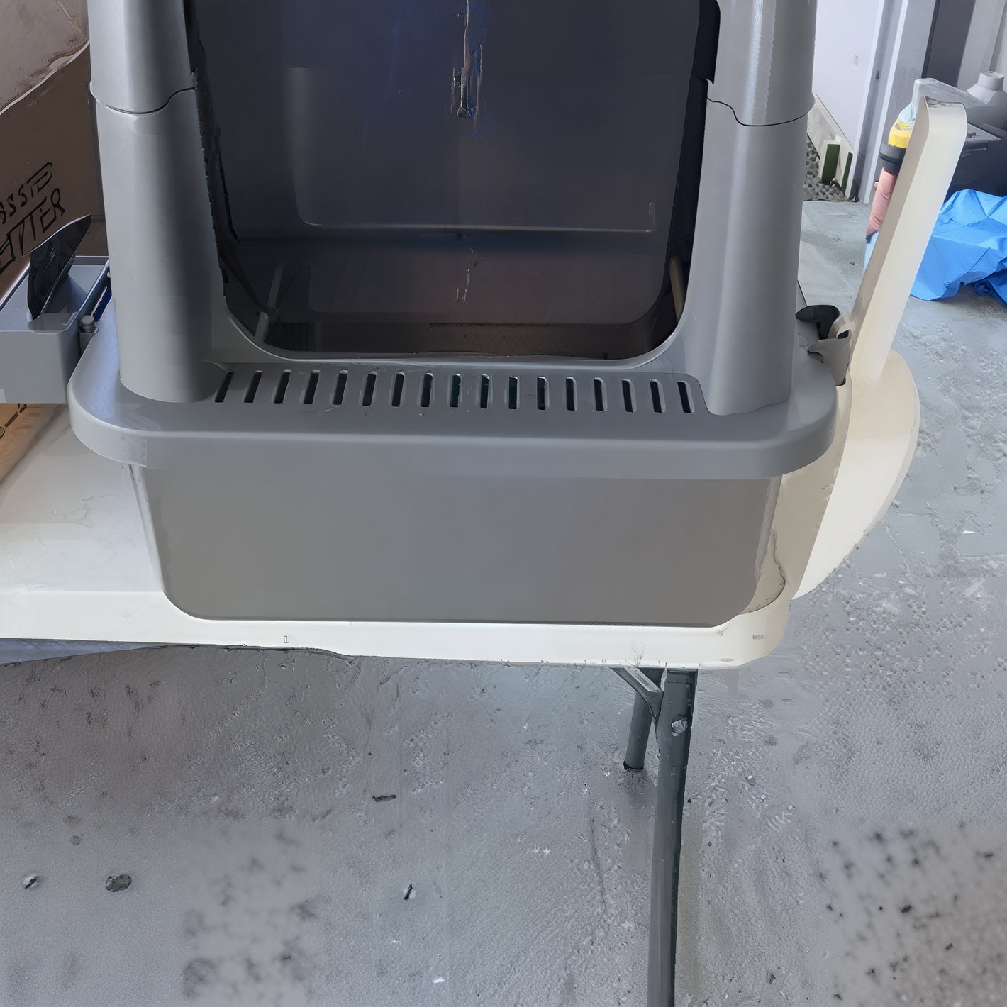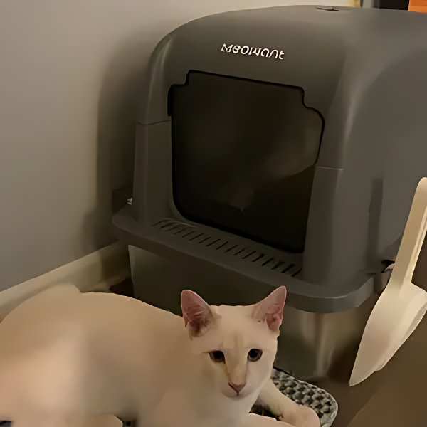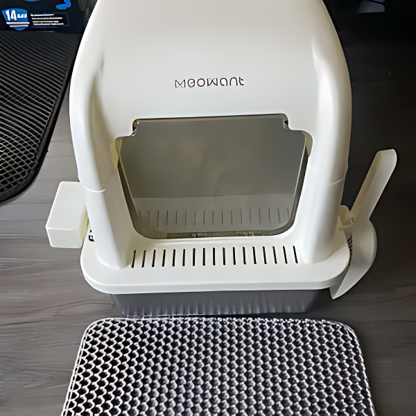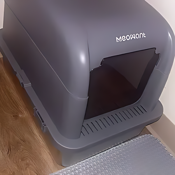 The litter box features a 3-in-1 detachable design for easy cleaning. Simply remove the tray, scoop out waste, and wash the components with warm soapy water.